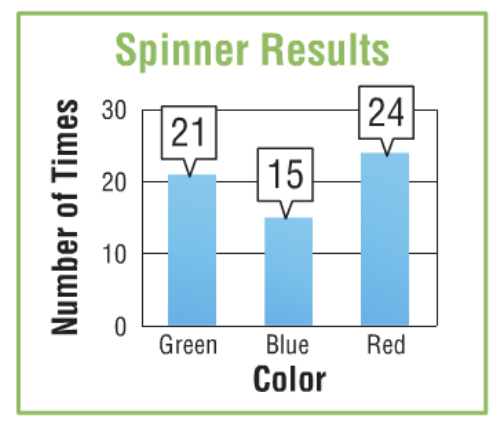 The graph shows the results of an experiment in which a spinner with 3 equal sections is spun sixty times. What is the experimental probability of spinning green. Write your answer as a simplified fraction.