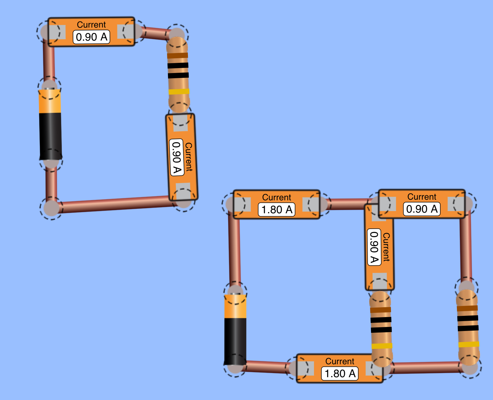 If a path branches into multiple paths, the current of all the breakaway paths will add to the original current.