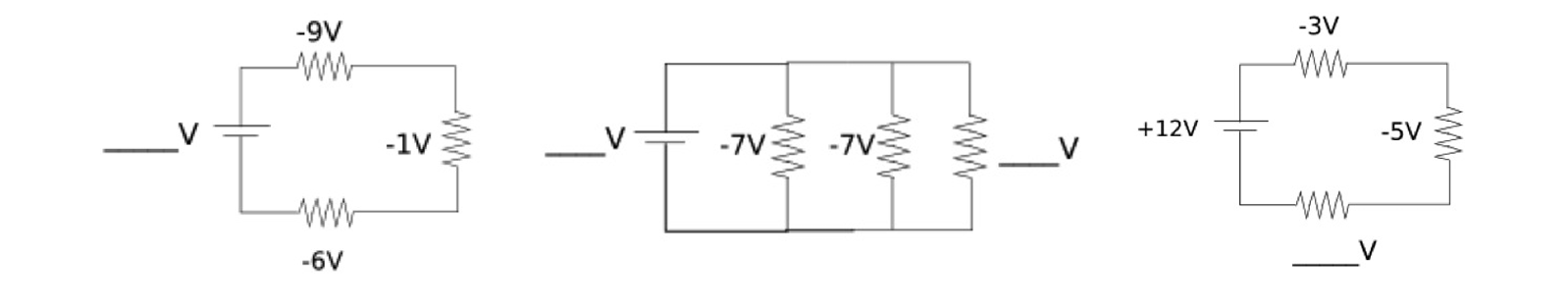 Use Kirchhoff’s Voltage Law to find the missing voltage differences in the following circuits. For these circuits, current flows clockwise and potential difference is measured clockwise.