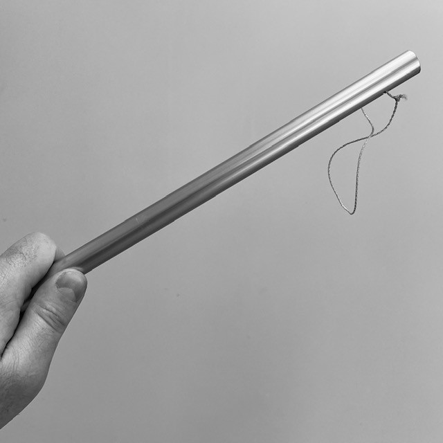 Zoek de klankbuis met het touw eraan. Houd de staaf in je hand (niet aan het touw) en tik met een potlood op de buis. Wat hoor je als je op de staaf tikt.