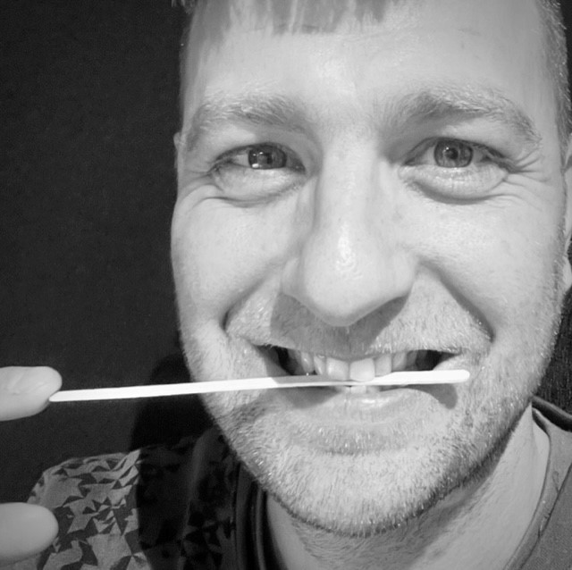 Klem een roerstaafje tussen je voortanden. Zorg dat het roerstaafje aan één kant uitsteekt. trek nu het uiteinde een klein stukje omlaag en laat je vinger van het uiteinde afschieten.
