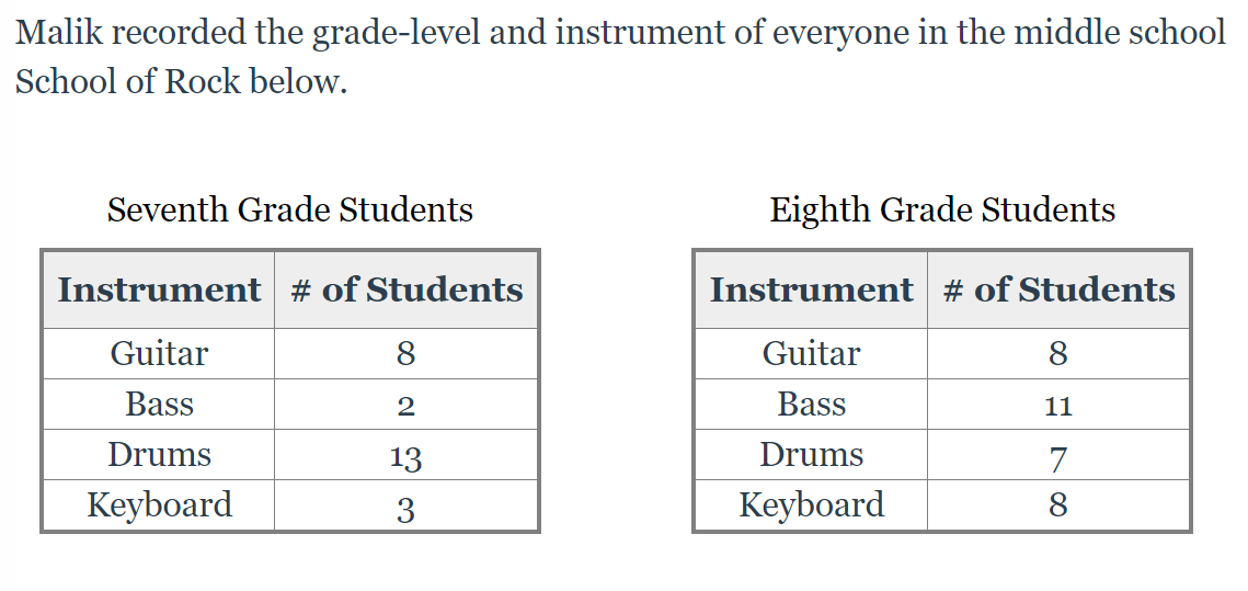 What is the probability that a student does not play Guitar between the 7th and 8th grade students who play an instrument? Write your answer as a fraction.