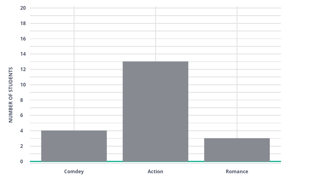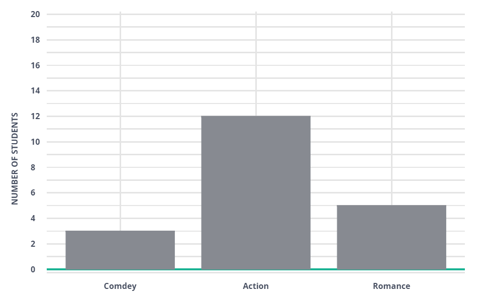 A class of 20 were surveyed about which type of movie is their favorite. They had to choose between comedy, action, or romance. About 25% of the students said that comedy was their favorite, about 60% said action, and about 15% said romance. Choose the bar graph that aligns with the data given.