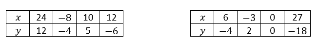 Identify which table below represents a direct variation and then write the equation representing that direct variation.