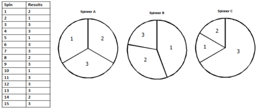 A student played a game using one of the spinners below. The table shows the results of 15 spins. Which spinner did the student use?