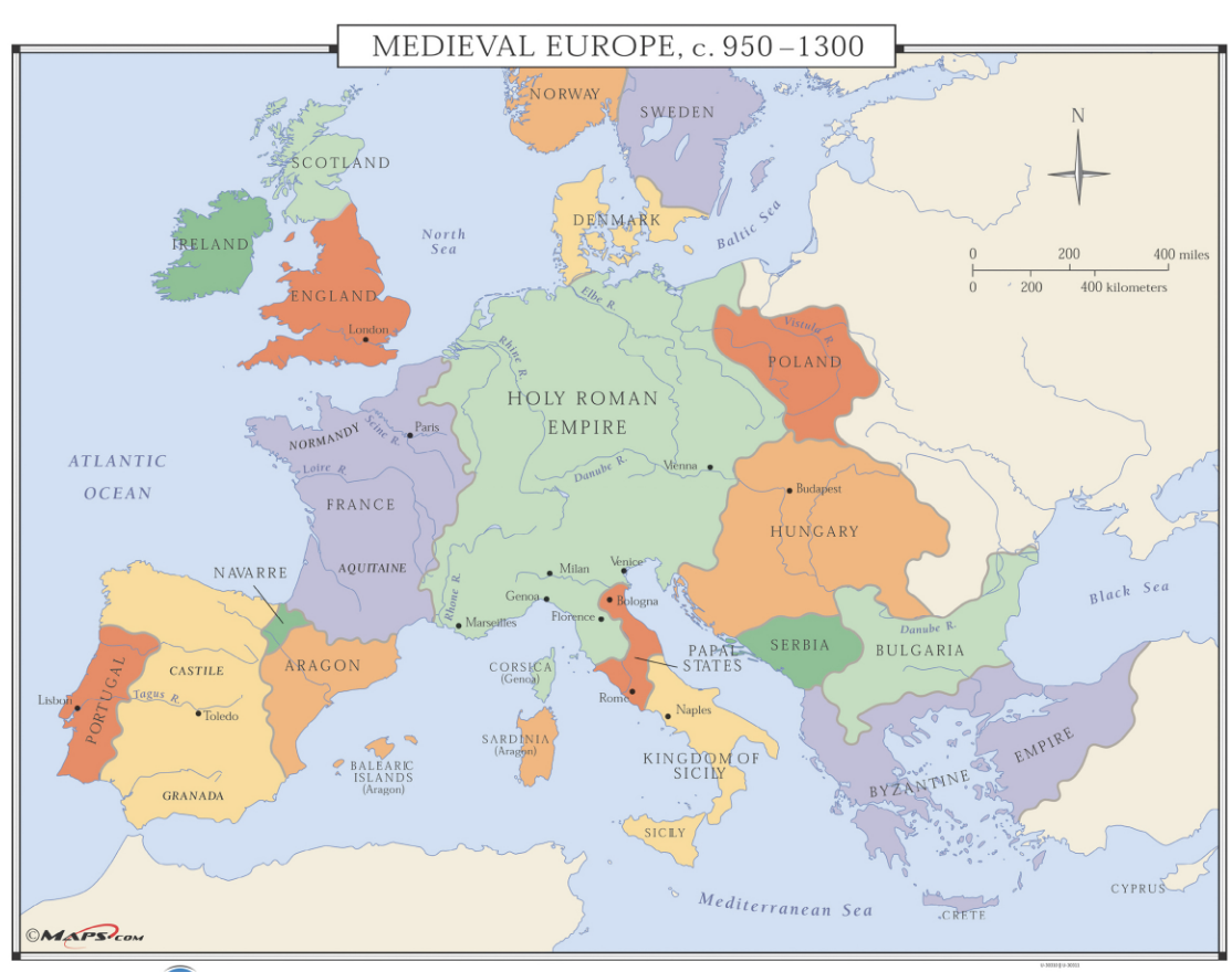 Additionally, the map of medieval Europe highlights the influence of the Catholic Church, which played a central role in shaping society and politics during this time. Monasteries, cathedrals, and pilgrimage sites dotted the landscape, serving as important religious and cultural centers.