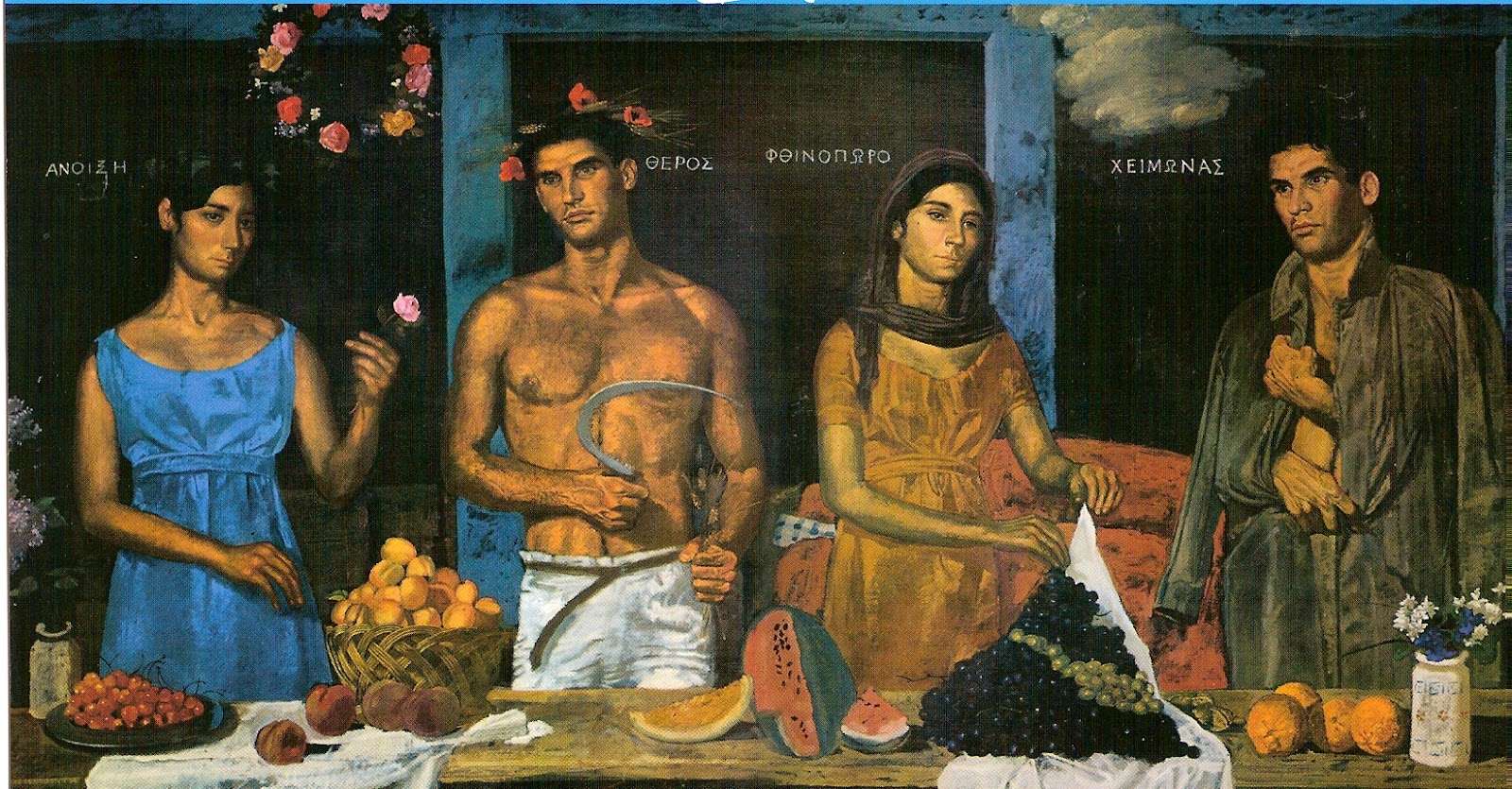 Ο πίνακας του Γιάννη Τσαρούχη «Οι Τέσσερις Εποχές» απεικονίζει τις εποχές ως ανθρώπινες μορφές, δύο άνδρες και δύο γυναίκες, που στέκονται μπροστά σ’ ένα τραπέζι με φρούτα. Με τον τρόπο αυτό αναδεικνύει την ομορφιά της ανθρώπινης ύπαρξης και δίνει έμφαση σε απλά καθημερινά πράγματα. Παρατηρώντας προσεκτικά τον πίνακα προσπαθούμε να διακρίνουμε τις τέσσερις εποχές του χρόνου και να απαντήσουμε στις παρακάτω ερωτήσεις.