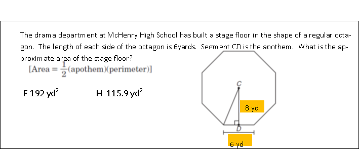 The drama department at McHenry High School has built a stage floor in the shape of a regular octagon. The length of each side of the octagon is 6 yards. Segment CD is the apothem. What is the approximate area of the stage floor?