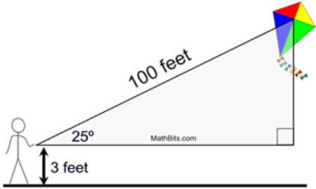 A student lets out 100 feet of string on a kite from a hand height of 3 feet. The angle between horizontal hand height and the kite is 25º. Find the height of the kite above the ground, to the nearest foot.