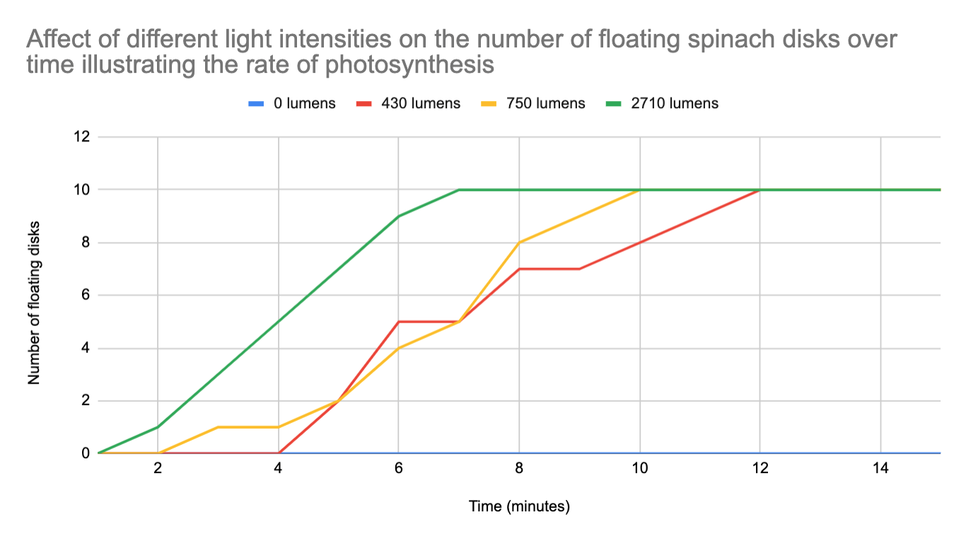 Look at your graph/data and analyze it (address why you think the data turned out the way it did addressing information you know about photosynthesis). Be sure to use specific data from the graph and vocabulary.