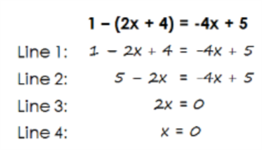 Re-solve the equation 1 – (2x + 4) = -4x + 5 to find the correct solution. __________