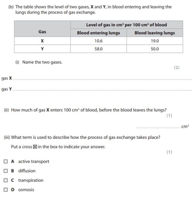 How much of gas X enters 100 cm3 of blood before the blood leaves the lungs?