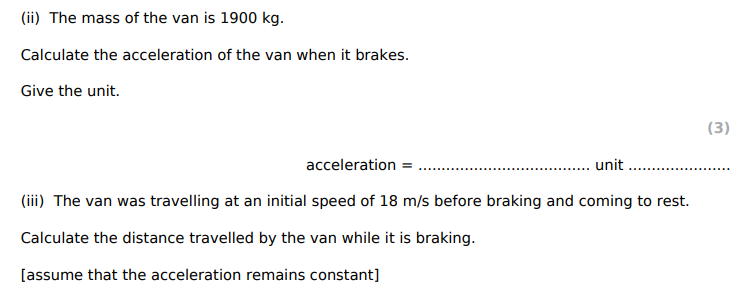 The mass of the van is 1900 kg. Calculate the acceleration of the van when it brakes (2 decimal places). Give the unit.