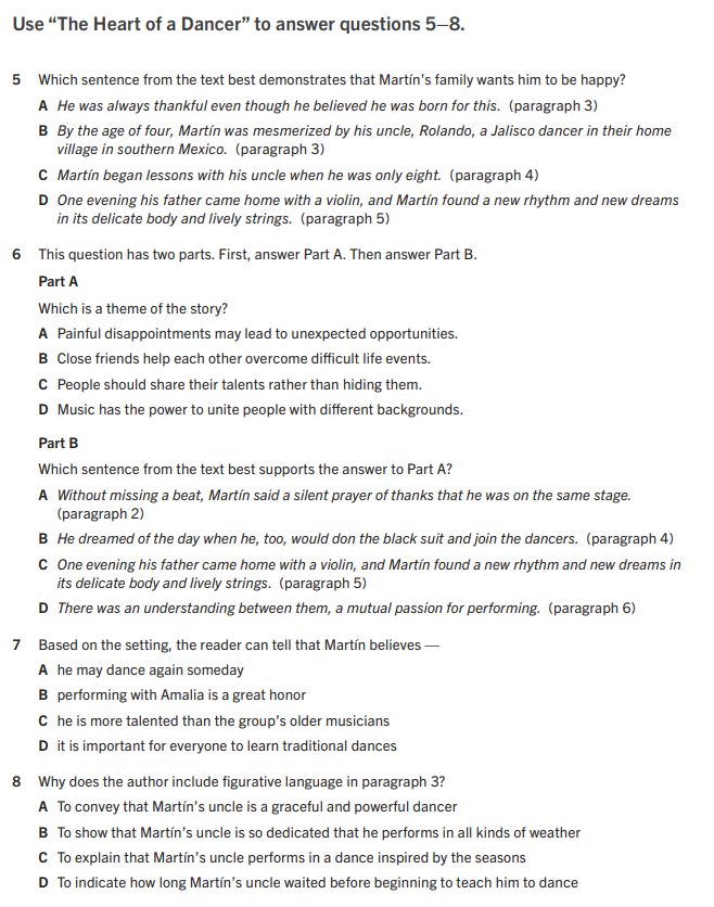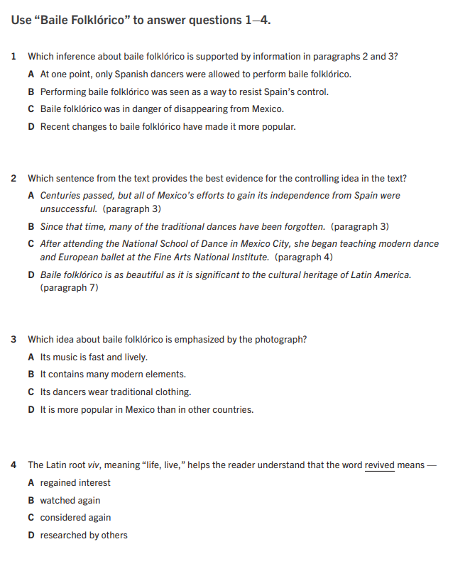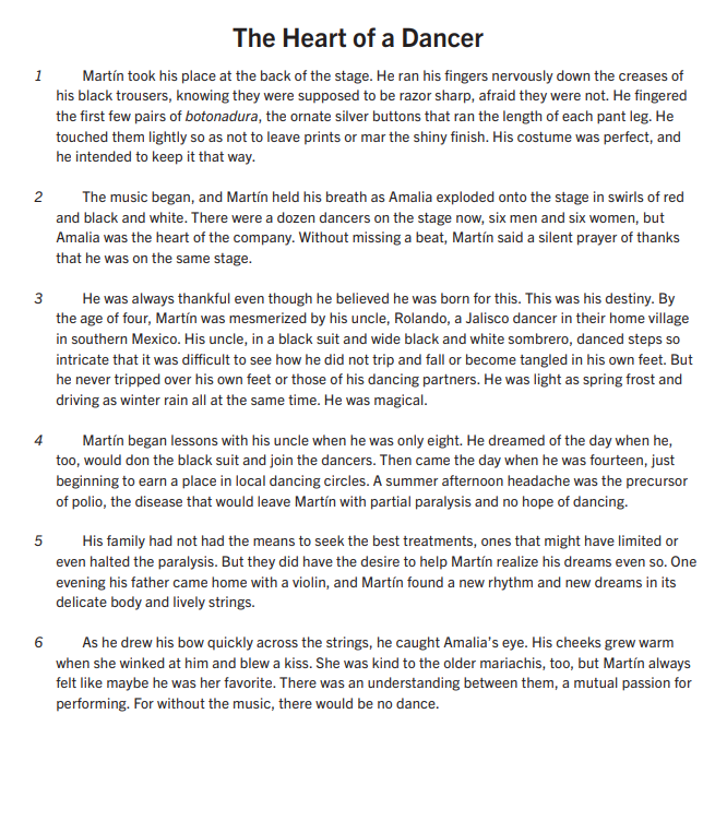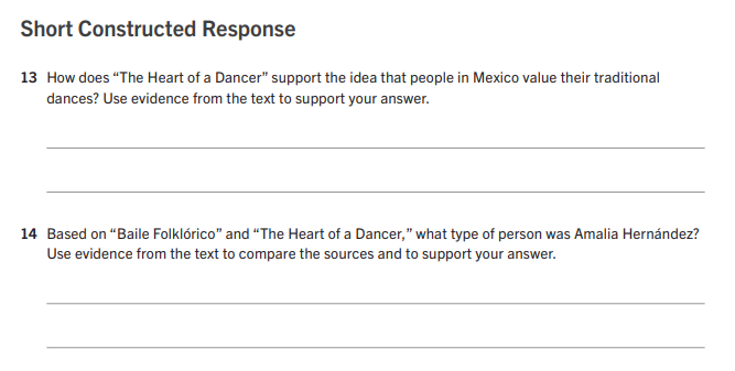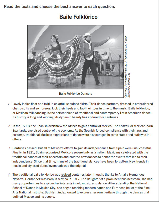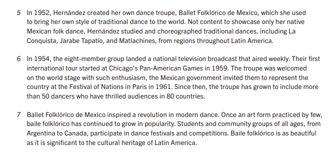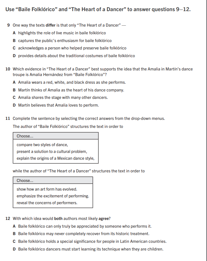 The author of "Baile Folklórico" structures the text in order to_________________________________________________ while the author of "The Heart of a Dancer" structures the text in order to____________________________________________