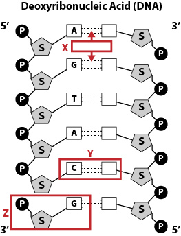 Deoxyribonucleic acid, or DNA, is found in all living organisms. The structure of DNA allows it to be quickly and easily copied so that it can be passed down through generations. An incomplete model of DNA is shown in the image.