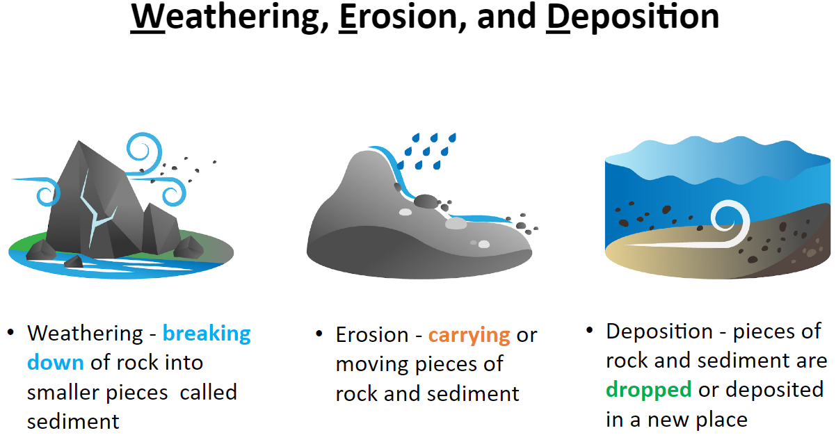 breaking down of rock into smaller pieces called sediment