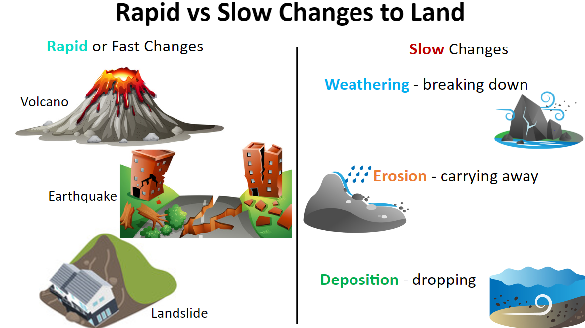 Landslides, earthquakes, and volcanoes change landforms faster than weathering, erosion, and deposition. How do landslides, earthquakes, and volcanoes change the land rapidly?