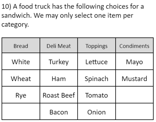 If you can only select ONE item per category, how many TOTAL combinations can you make?