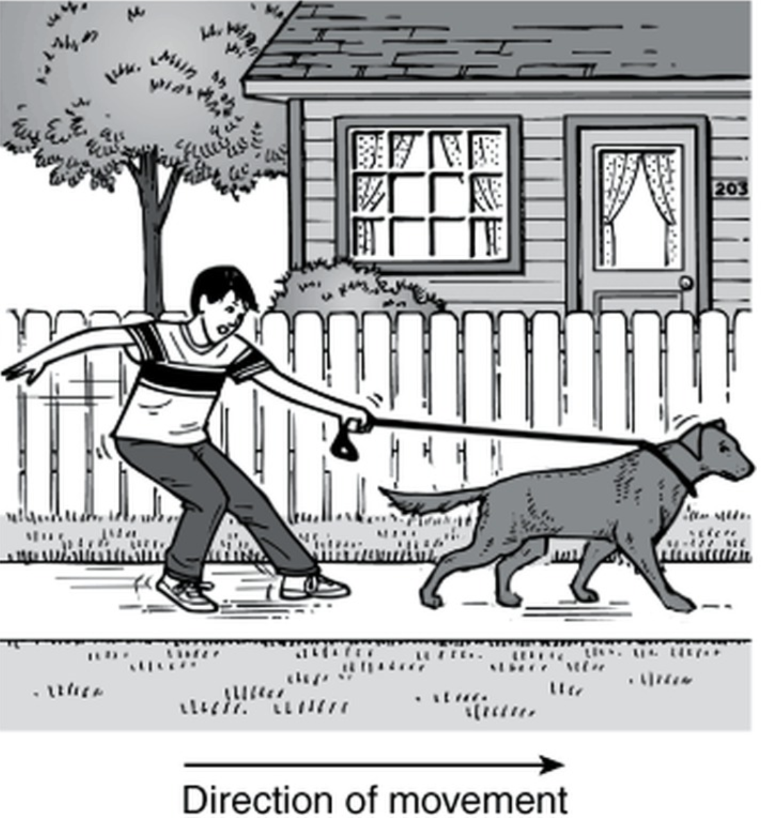 In this picture, a boy is trying to pull a dog on a leash, but the dog and the boy are accelerating in the same direction to the right. Which of the following best describes the forces in this situation?