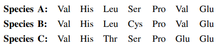 The amino acid sequences of three species shown below were determined in an investigation of evolutionary relationships. Based on these data, which two species are most closely related?