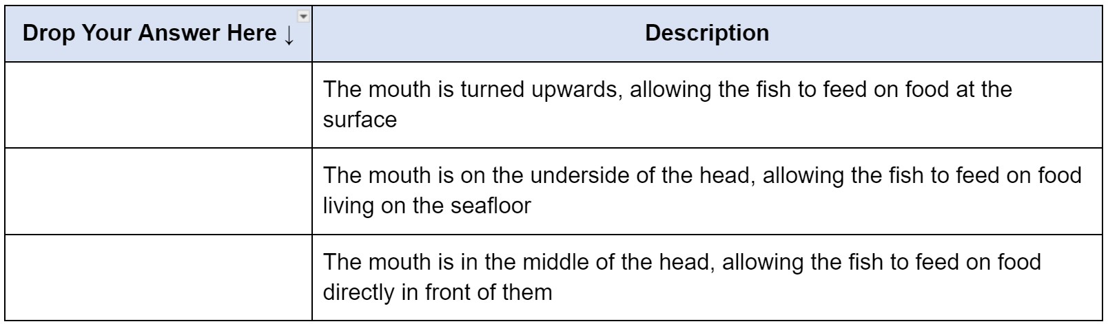 Fish have various mouth shapes. Complete the table using the words in the word bank.