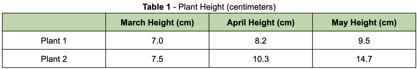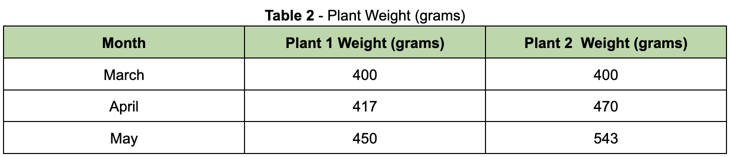 Harold planted two of the same plants with the same soil in March. Plant 1 was placed in the classroom with the lights on for 3 hours a day. Plant 2 was placed outside in the garden. Harold measured the height of the plants and recorded the information on a data table. He also weighed each pot, plant, and soil in March, April, and May. The data tables are shown below.