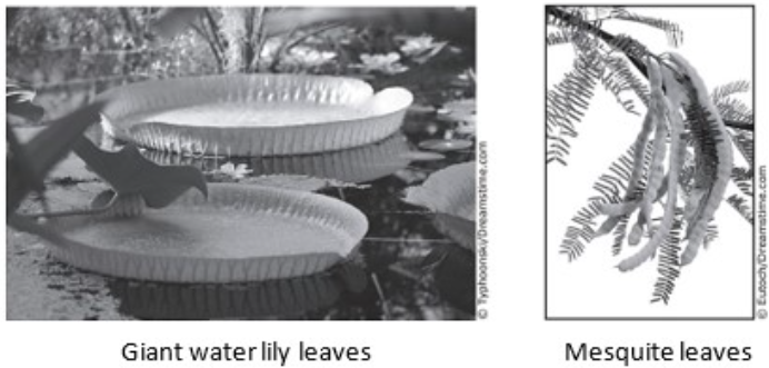 The leaves of both plants have different structures. What differences in the structure of the leaves of these plants likely help them survive in their environments?