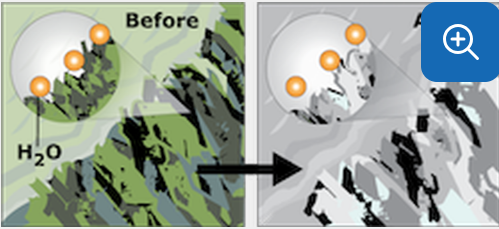 Hydrolysis | arrow_right_alt | Potassium feldspar in igneous rock is a silicate mineral that reacts with slightly ionized water to form a new mineral |