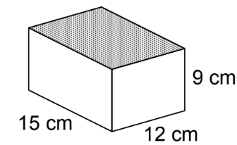 A box has a length of 15 cm, a width of 12 cm, and a height of 9 cm. The lid of the box is gray as shown in the diagram.