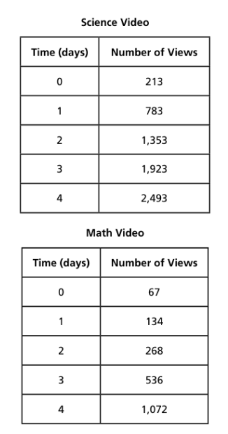 An educational website offers online tutorial videos on different subjects. The relationship between the number of views and the time, in days, that the videos have been online are shown for two different tutorial videos.