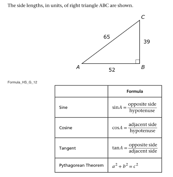 Which trigonometric measure of ∠ A is equal to 3/4?