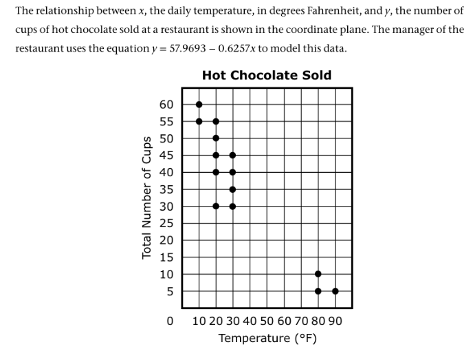 The number of cups of hot chocolate that are sold __________ by __________ for every __________ in temperature of 1 degree