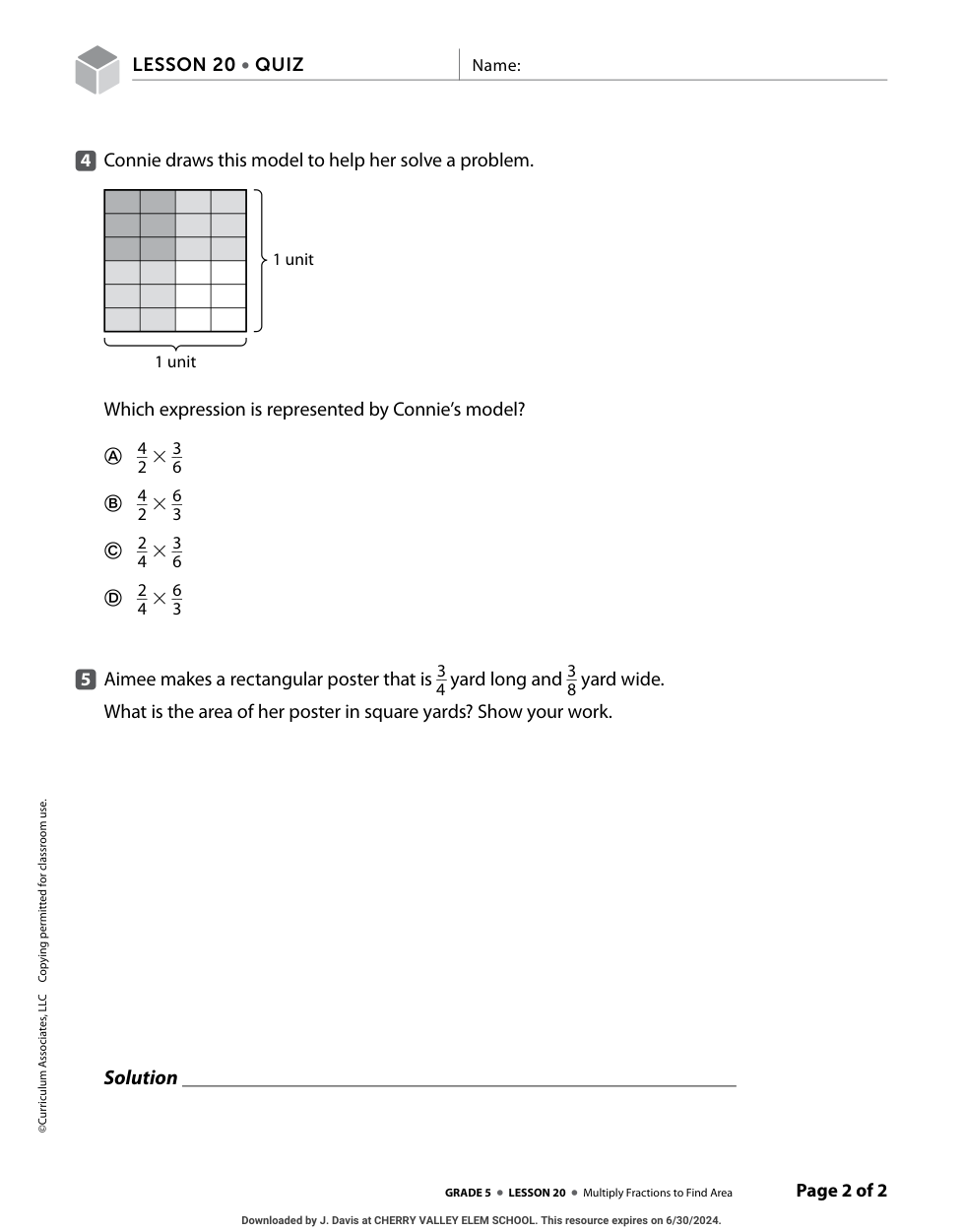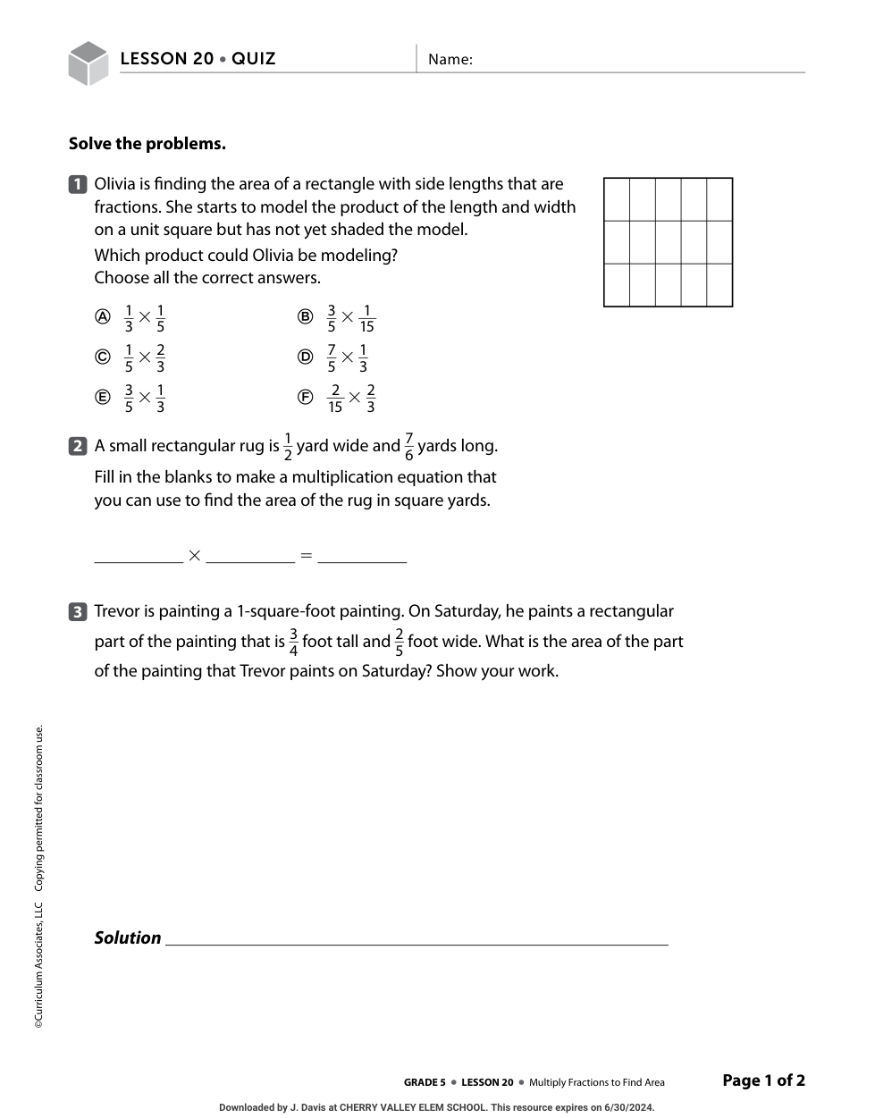 Olivia is finding the area of a rectangle with side lengths that are fractions. She starts to model the product of the length and width on a unit square but has not yet shaded the model. Which product could Olivia be modeling? Choose all the correct answers.