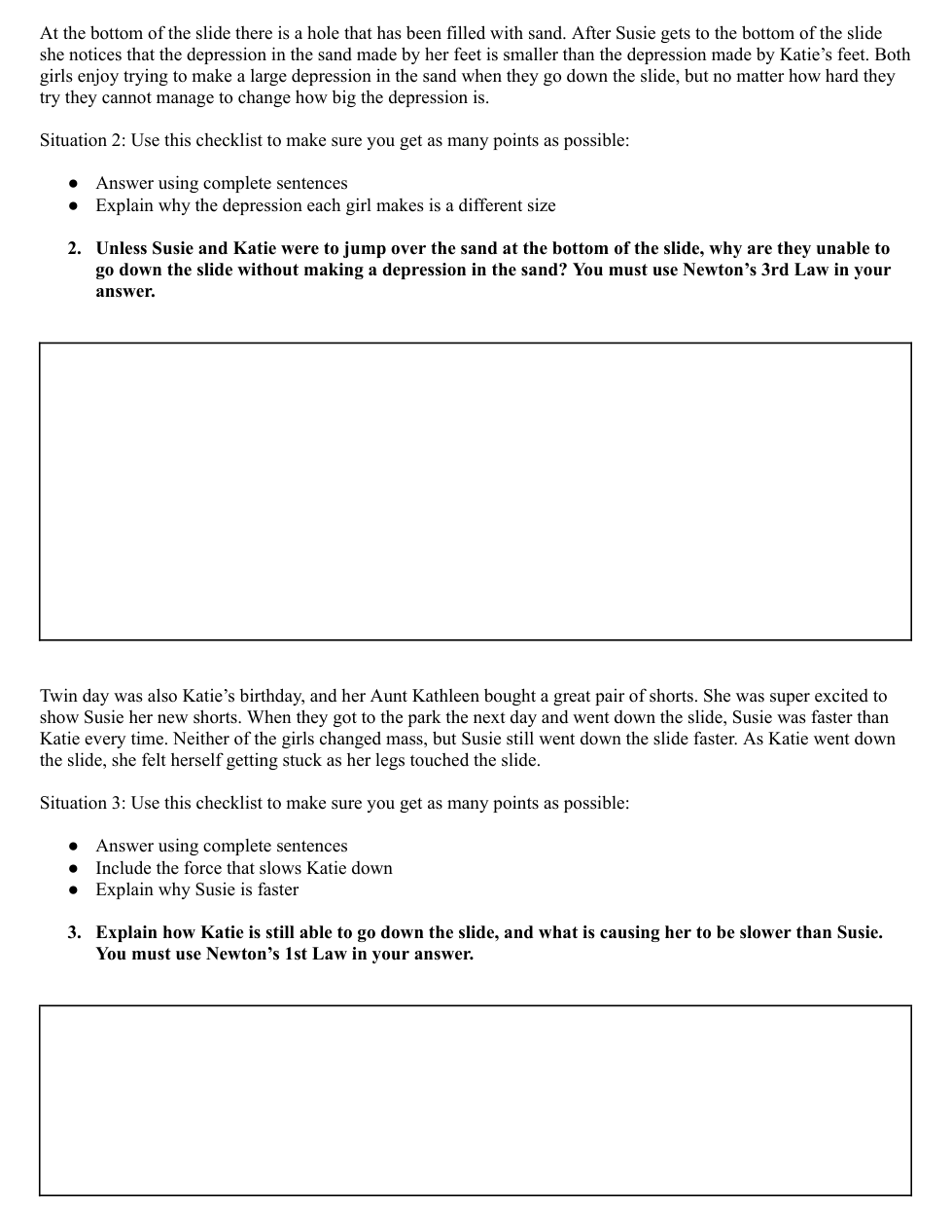 Unless Susie and Katie were to jump over the sand at the bottom of the slide, why are they unable to go down the slide without making a depression in the sand? You must use Newton’s 3rd Law in your answer.
