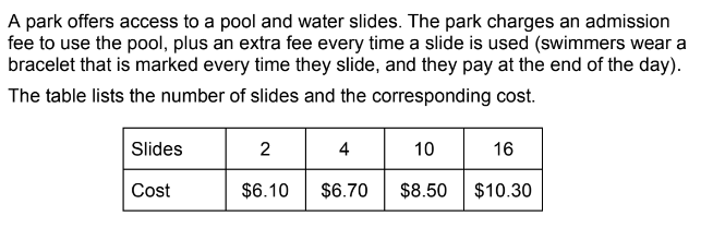 What is the cost of going to the pool without going on any slides (y-intercept)?