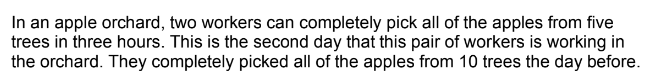 Using your equation from #8, if there are a total of 100 trees to pick in the orchard, how many hours will it take to pick them all? Round to the nearest hour.