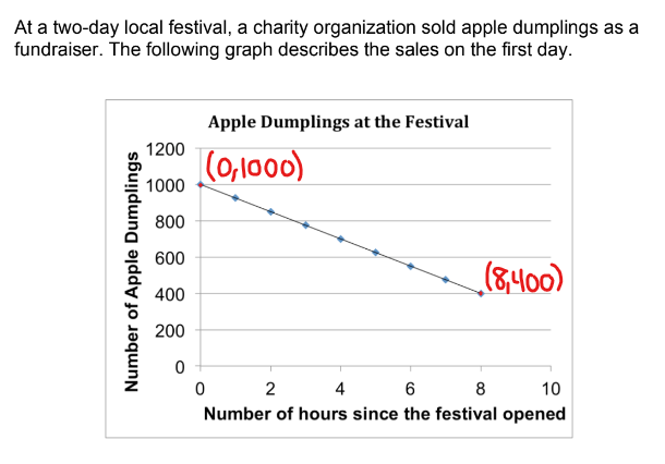 Write an equation in slope-intercept form (y = mx +b) that represents the relationship between the number of apple dumplings sold and the hours of the festival.
