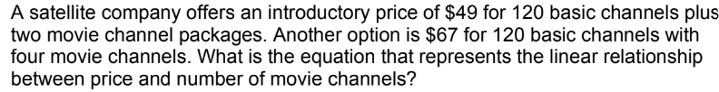 Hint: Use the coordinate pairs: (2, $49) and (4, $67) to find the slope and y-intercept before writing the equation in slope-intercept form.