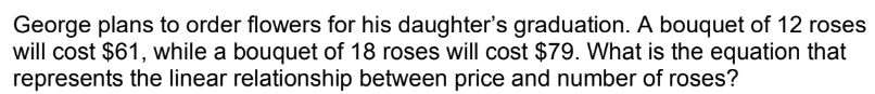 Hint: Use the coordinate pairs: (12, $61) and (18, $79) to find the slope and y-intercept before writing the equation in slope-intercept form.