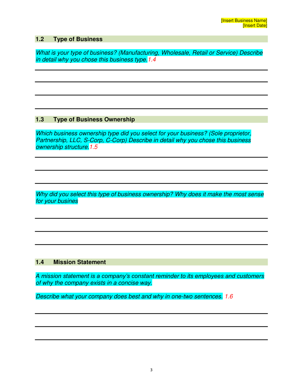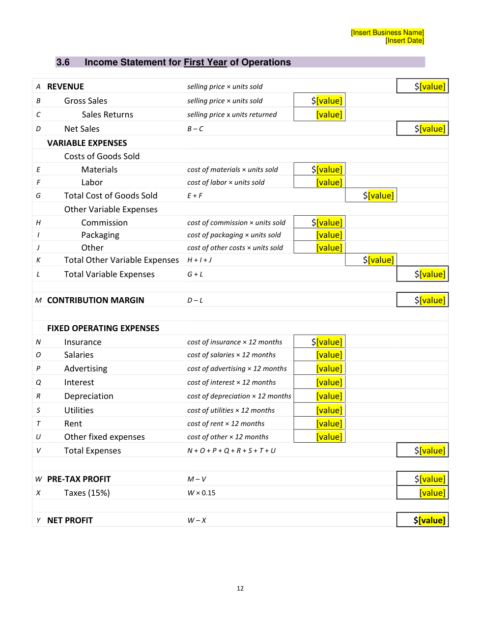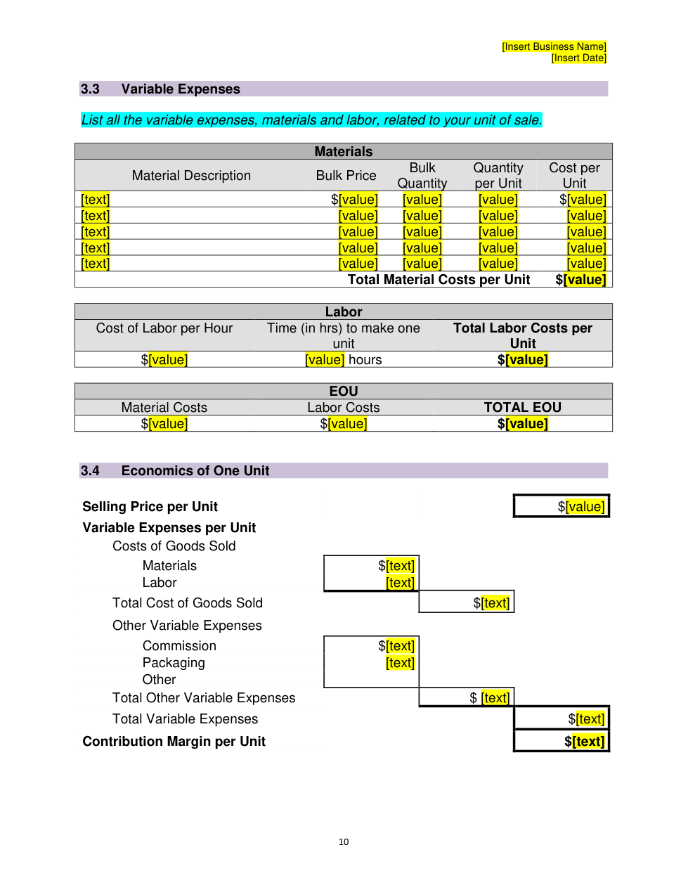 [Business Name] [Date] Question 10: 3.3 Variable Expenses List all the variable expenses, materials, and labor related to your unit of sale. Materials Material Description Bulk Price Bulk Quantity Quantity per Unit Cost per Unit [text] $ [value] [value] [value] $ [value] [text] [value] [value] [value] [value] [text] [value] [value] [value] [value] [text] [value] [value] [value] [value] Total Material Costs per Unit $ [value] Labor Cost of Labor per Hour Time (in hrs) to make one unit Total Labor Costs per Unit $ [value] EOU (Economics of One Unit) Material Costs Labor Costs TOTAL EOU $ [value] $ [value] $ [value]