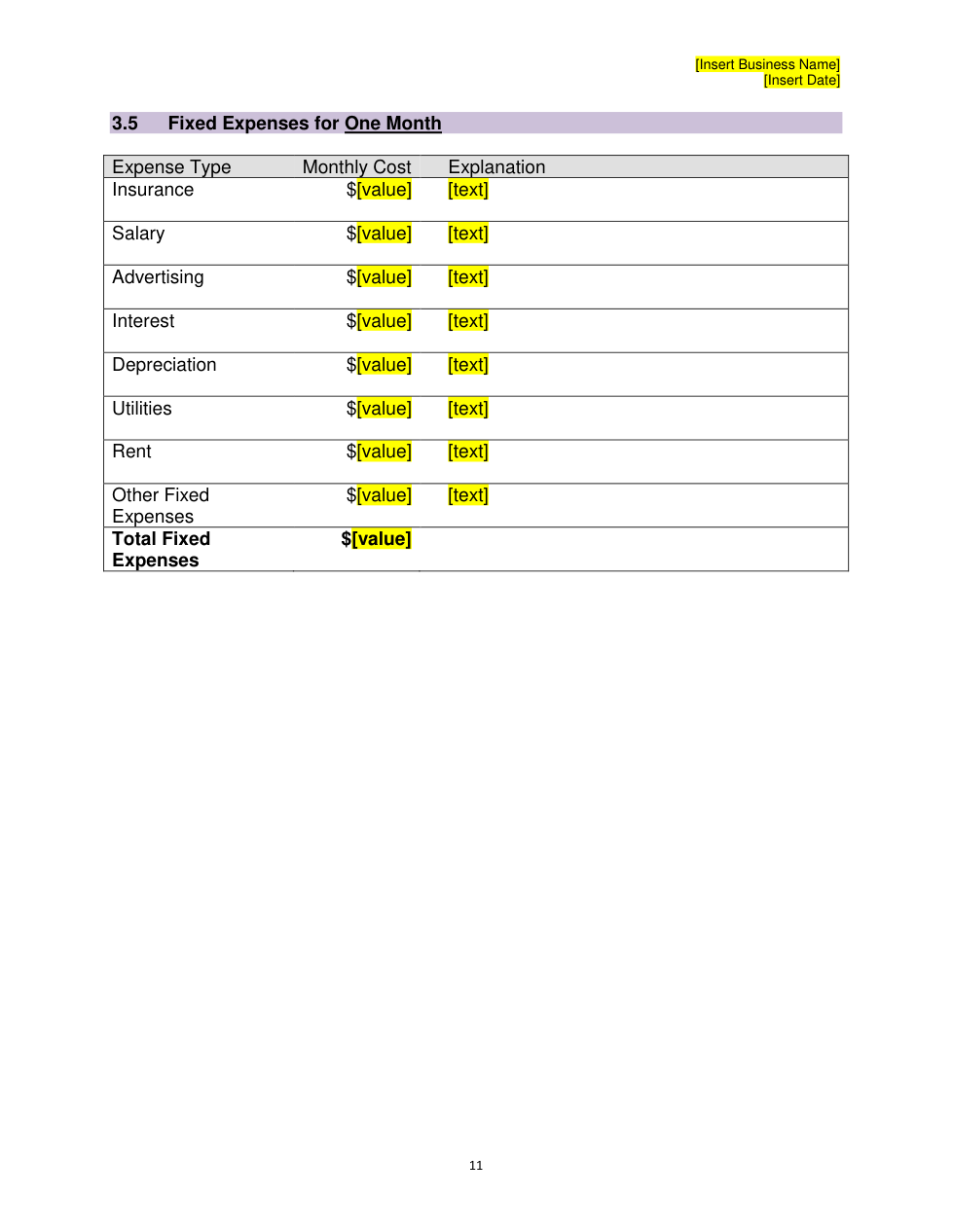 List the Expense Type, Monthly Cost, and Explanation for each fixed expense.