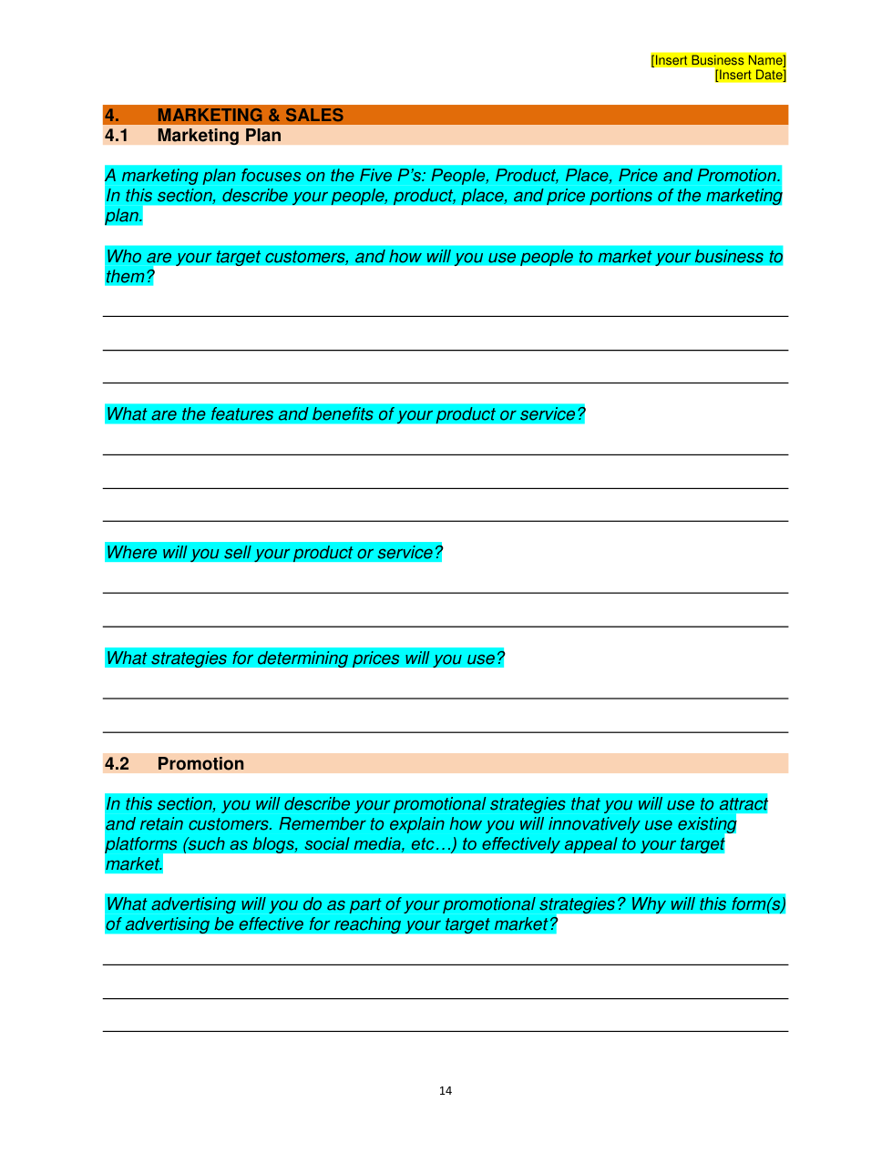 A marketing plan focuses on the Five P’s: People, Product, Place, Price, and Promotion. In this section, describe your people, product, place, and price portions of the marketing plan.