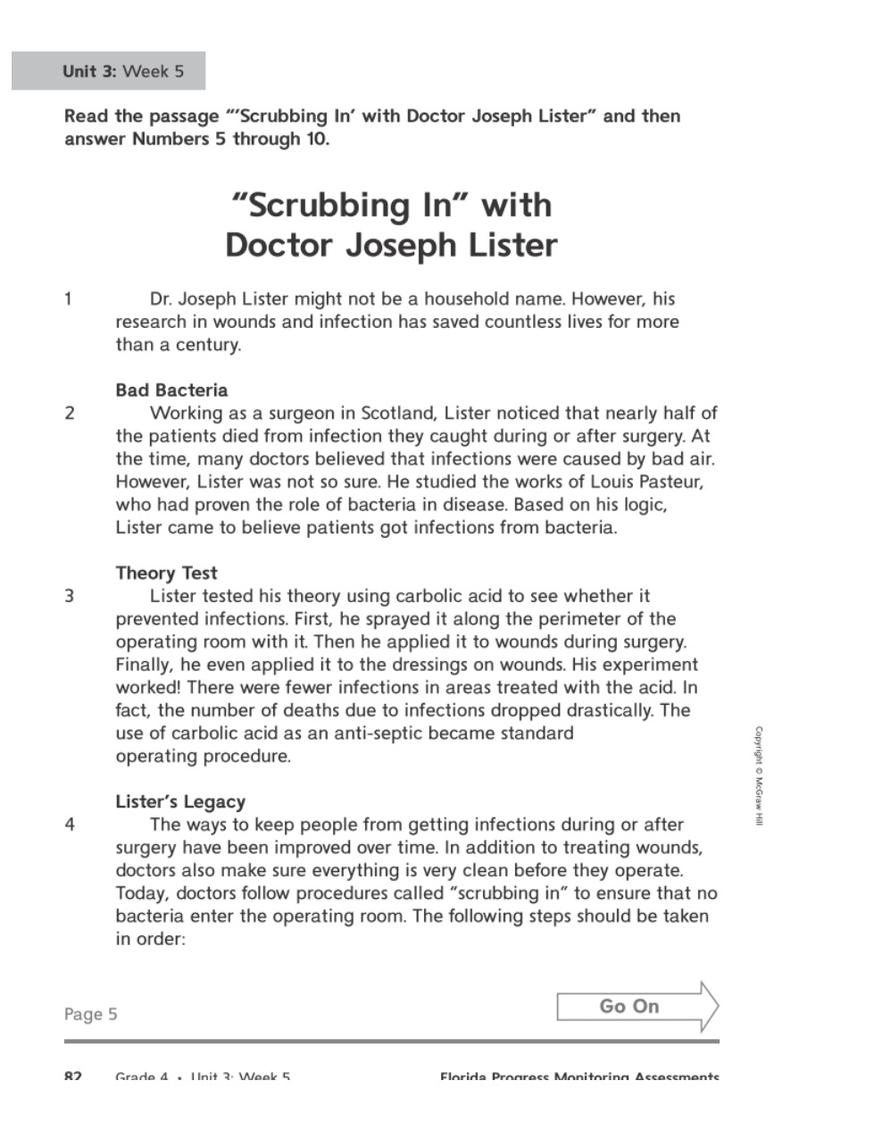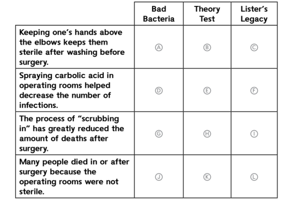 "Lister tested his theory using carbolic acid to see whether it prevented infections."