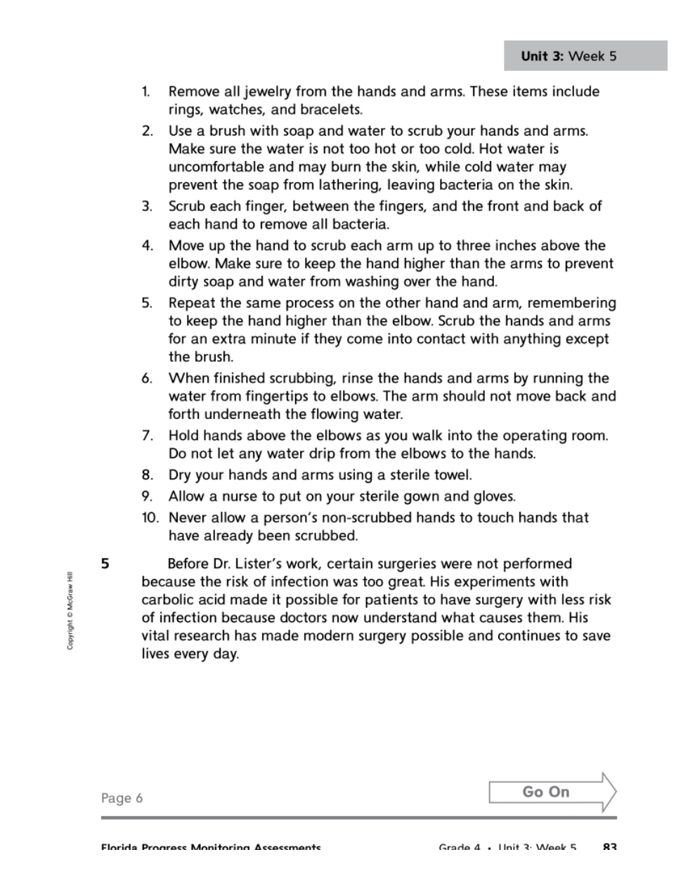 Choose the bubbles to place the steps of the "scrubbing in" process in the order they appear in the passage.