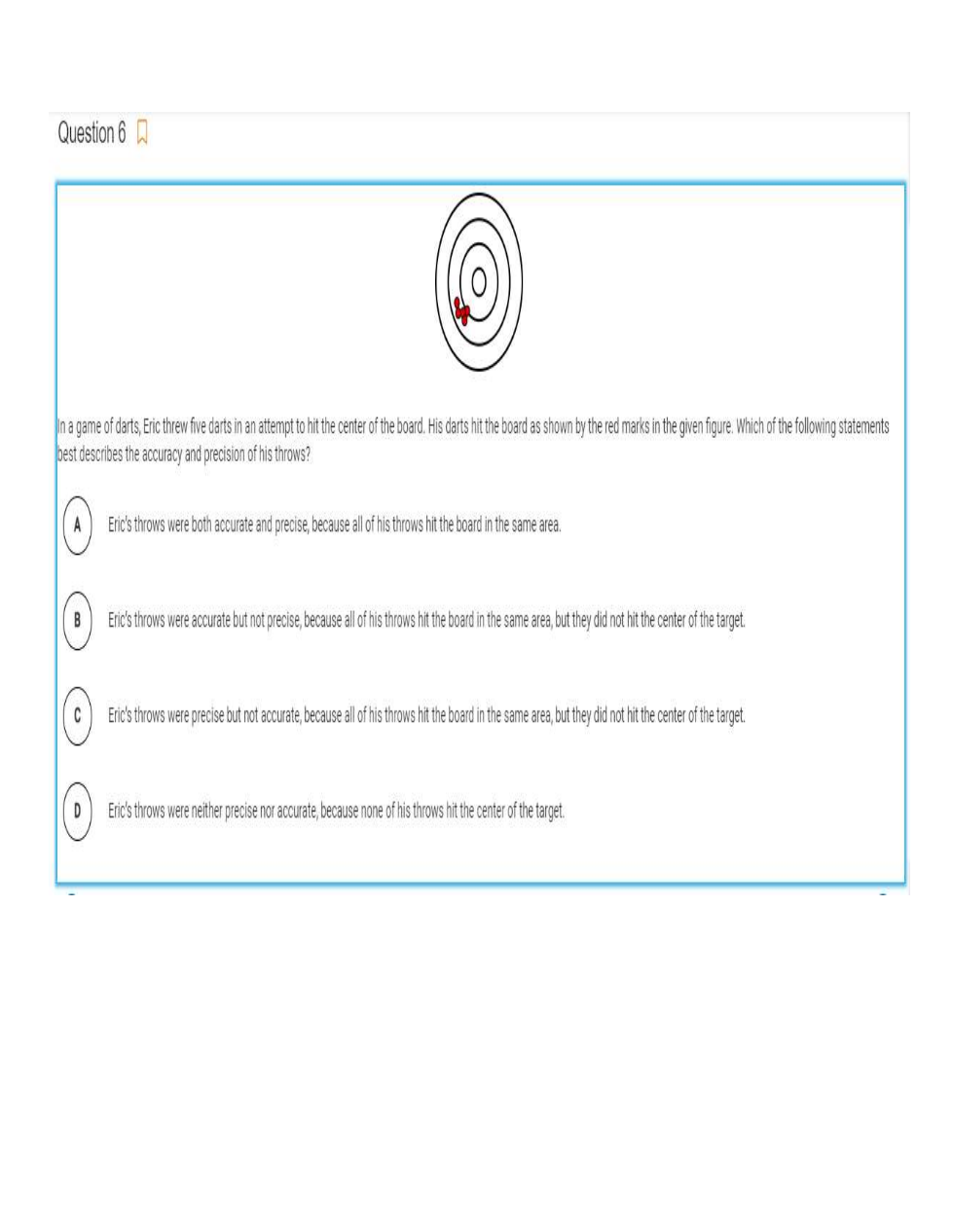 Eric throws were neither precise nor accurate, bacuse non of his throws hit the center of the target.