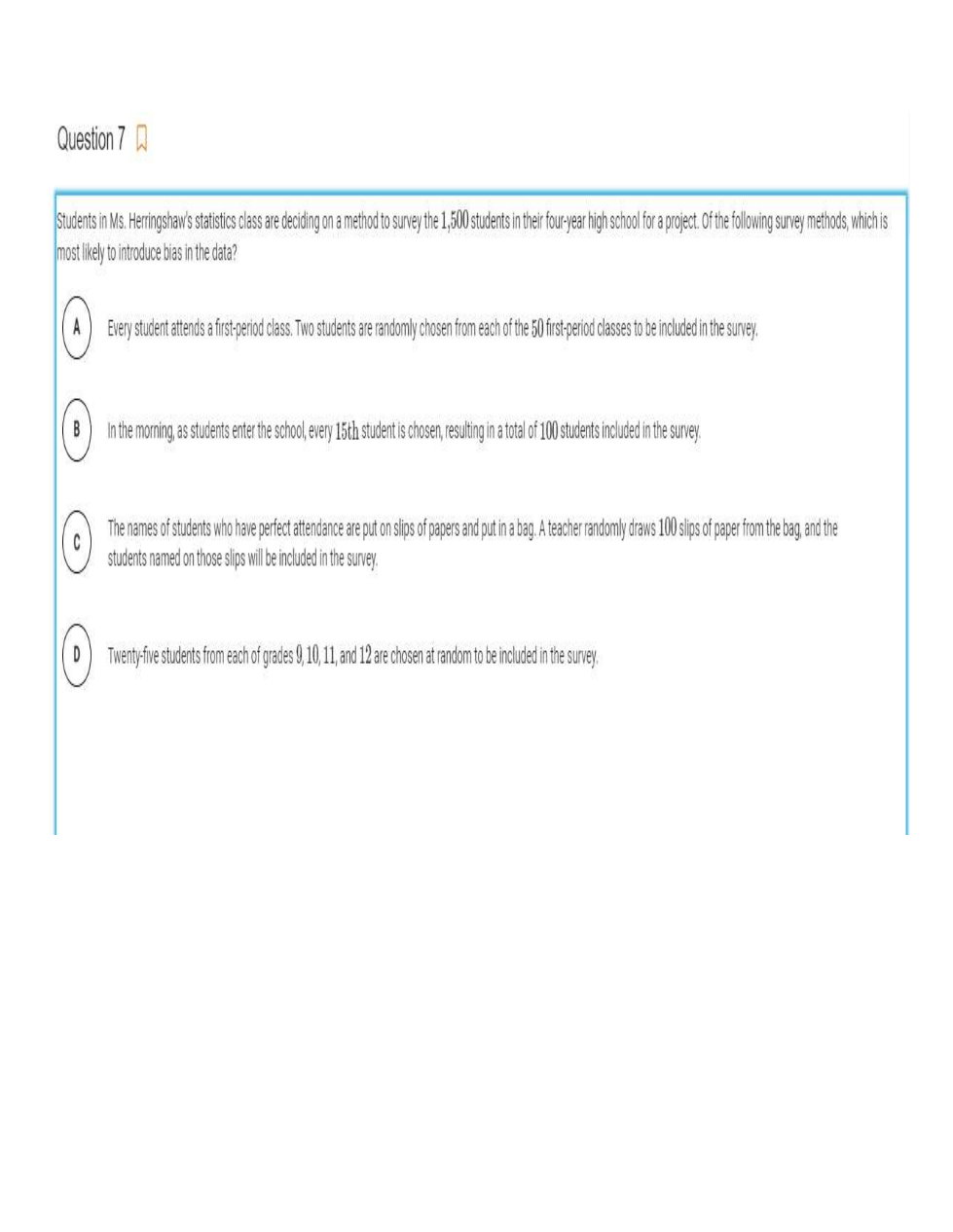 In the morning as students enter the school, every 15th student gets chosen, resultin in atotal of 100 students included in the survey.