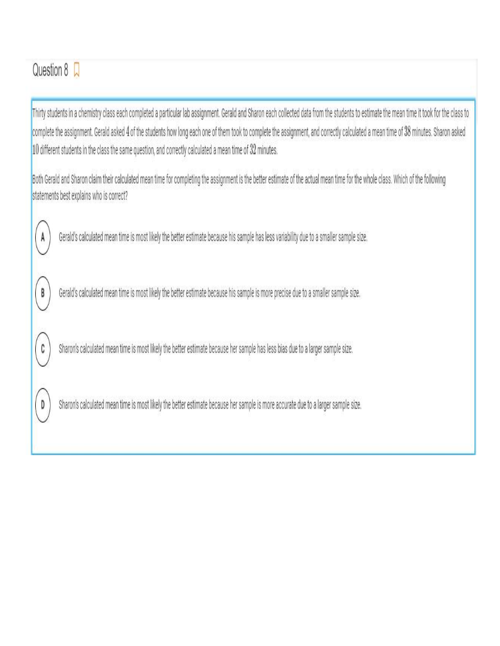 Sharon's calculated mean time is most likely the better estimate because her sample has less bias due to a larger sample size
