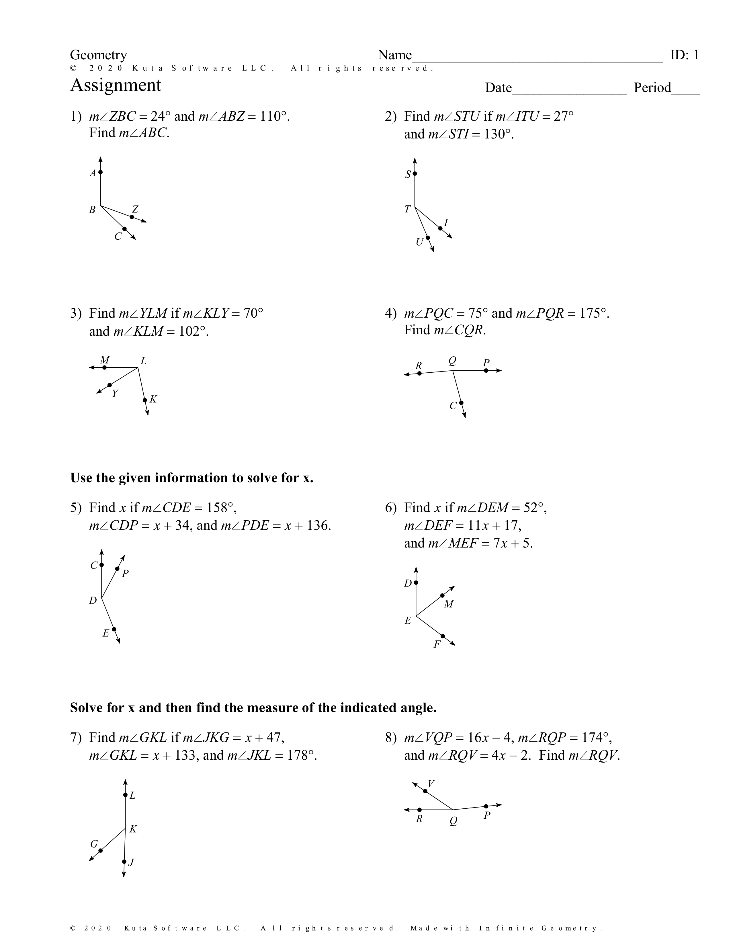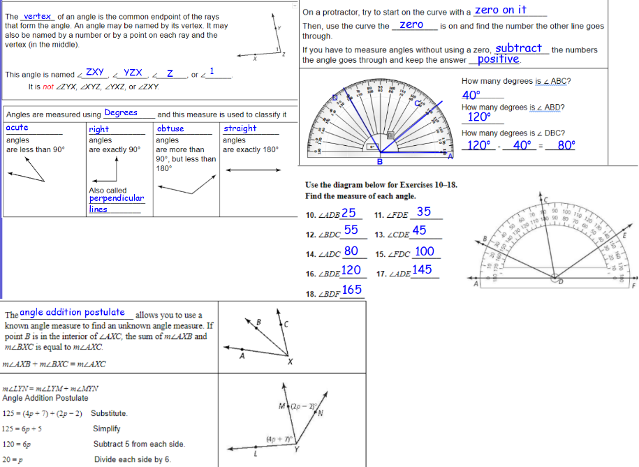 Write the given angle measures in the appropriate angle. and fill in the angle addition postulate