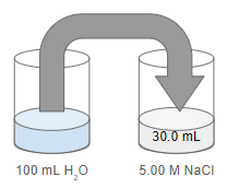 100 mL of water is added to 30.0 mL of a 5.00 M NaCl solution. The resulting concentration after this addition of water would be _______ M. Answer in 3.00 sig figs.