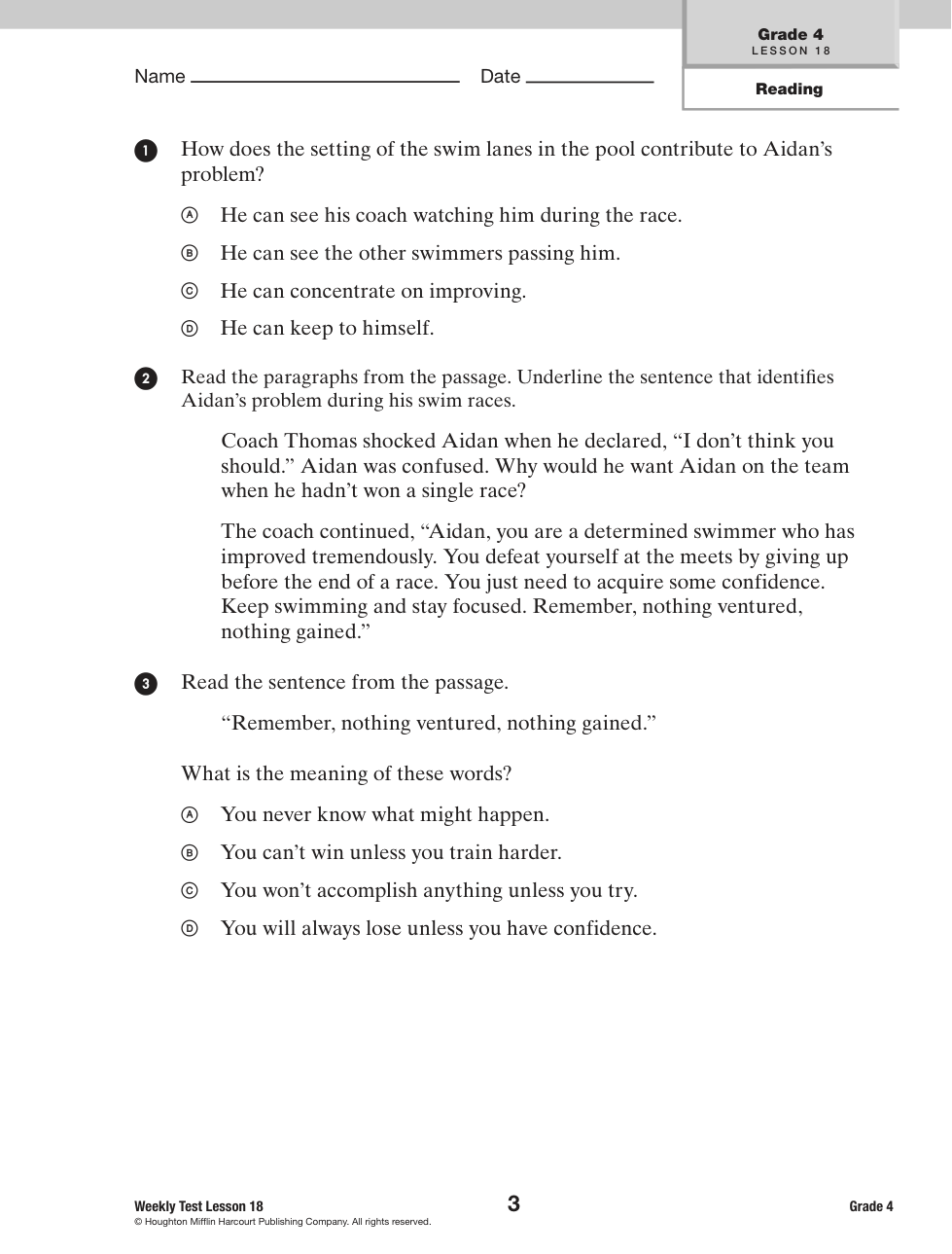 Coach Thomas shocked Aidan when he declared, “I don’t think you should.” Aidan was confused. Why would he want Aidan on the team when he hadn’t won a single race? The coach continued, “Aidan, you are a determined swimmer who has improved tremendously. You defeat yourself at the meets by giving up before the end of a race. You just need to acquire some confidence. Keep swimming and stay focused. Remember, nothing ventured, nothing gained.”